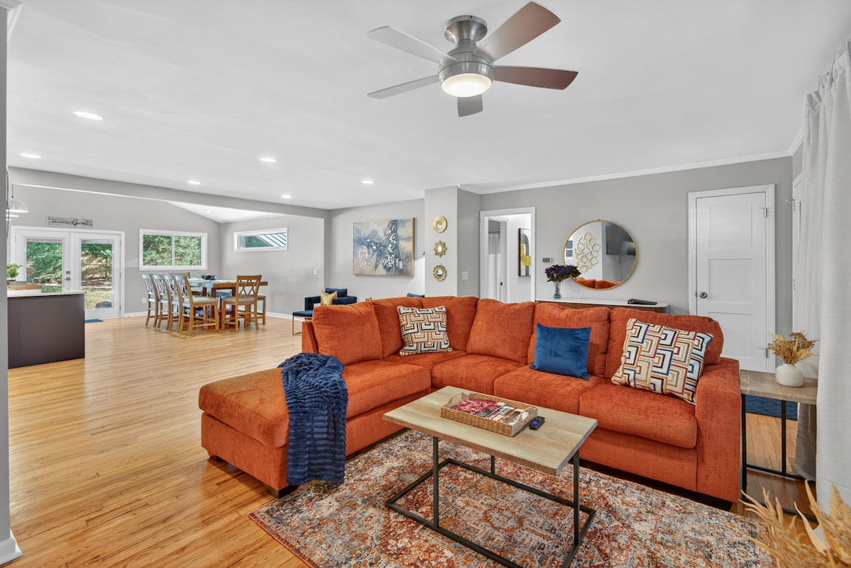 В этом доме с комфортом могут разместиться до 30 человек + друзья с домашними животными. Ухоженный спа-бассейн на 12 человек, тренажерный зал с велотренажером, массажные кресла, игровая комната с бильярдным столом и многое другое! Работаете удаленно? Не стесняйтесь использовать настенные столы. Роскошные кровати, отмеченные уровнем мягкости. Массажные регулируемые каркасы кроватей. Наслаждайтесь экранированным/открытым патио, грилем или кухней мечты шеф-поваров с эспрессо/кофемашинами и т. д. Парковка до 8 автомобилей и зарядное устройство для электромобиля/Tesla. Центральное расположение DT Durham и RDU. Всего в нескольких минутах ходьбы от аэропорта!