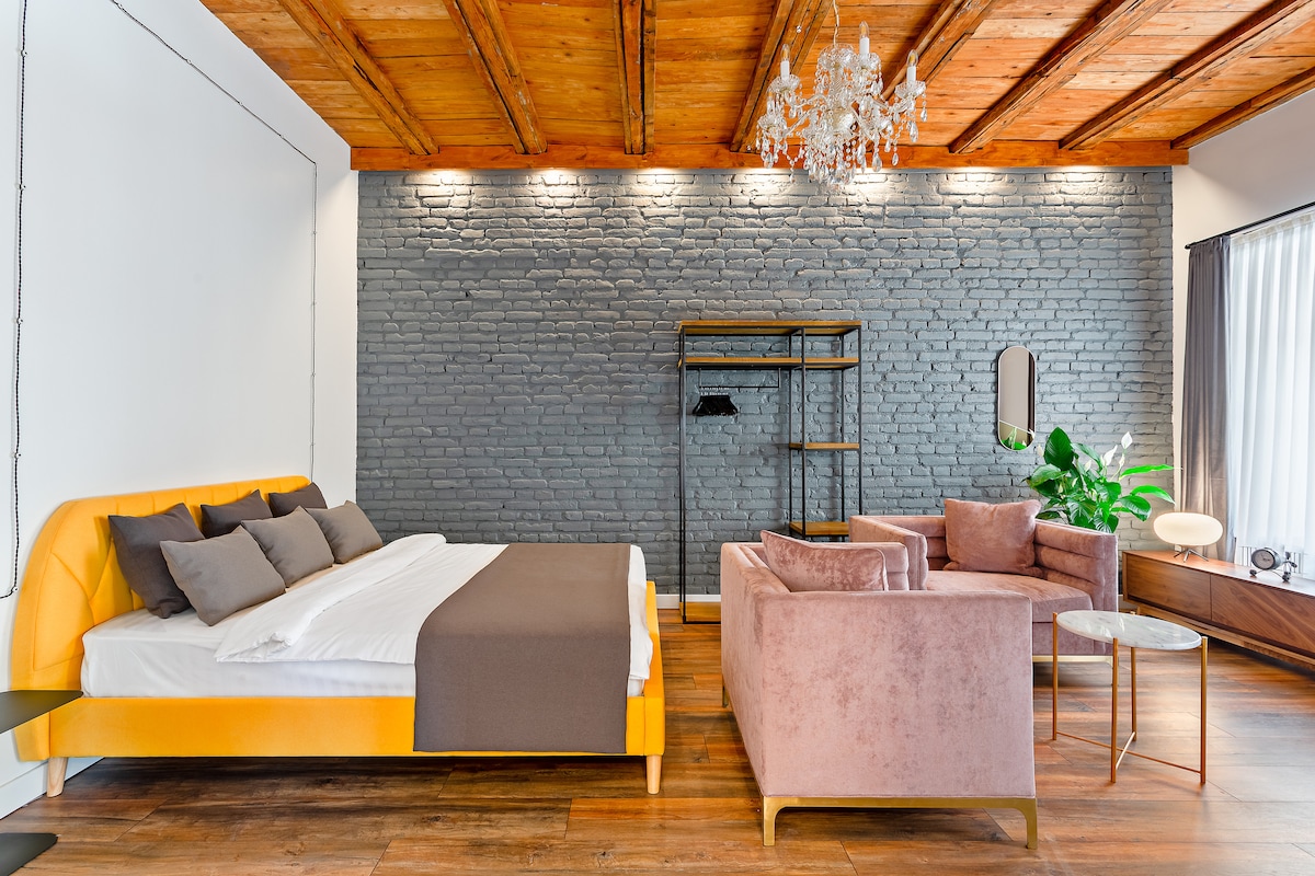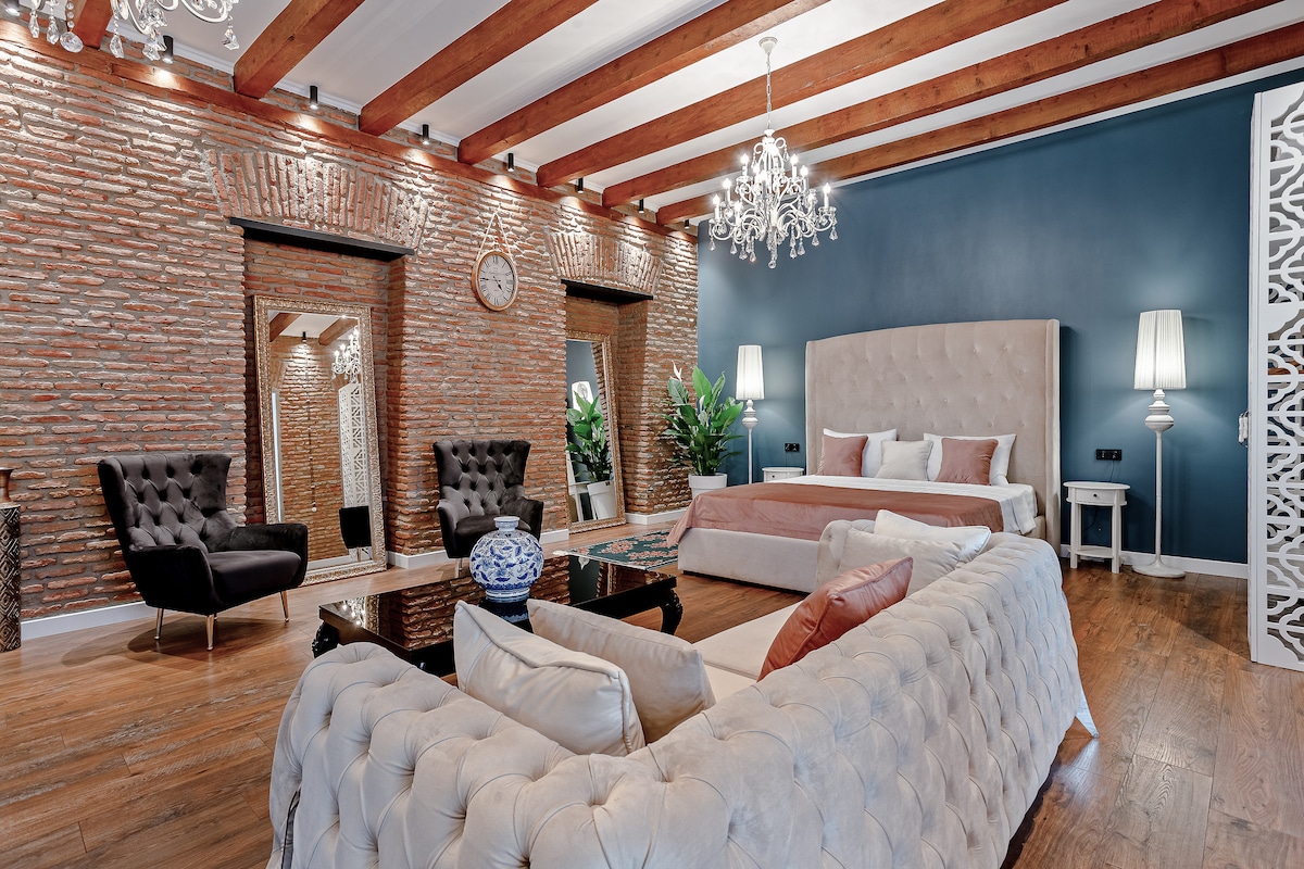 Это комфортабельная отремонтированная квартира с открытым кирпичом, которая имеет истинное ощущение Тбилиси. В этом номере-студио есть прозрачная ванная комната с современной ванной, кроватью размера «king-size», диваном Chesterfield и т. Д. Пространство (78 кв.м) подходит для 2 и расположено на Старом Тбилисском районе, на параллельной улице главного проспекта Грузии Шота Руставели. Высокоскоростной WIFI Интернет и IPTV предоставляются бесплатно. Квартира также хорошо расположена для транспорта. Станции метро Площадь Свободы и Руставели находятся в нескольких минутах ходьбы.
