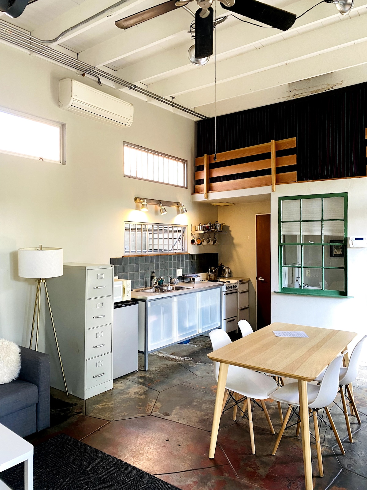 Живая/рабочая студия художника площадью 500 кв. футов с мини-кухней, ванной комнатой, шкафом и выходом в красивый сад в калифорнийском стиле. Студия отличается открытой и просторной атмосферой, с высокими потолками и большим количеством естественного света. Это чистое, удобное и творческое пространство со всем необходимым для длительного или короткого пребывания. Она имеет отдельный вход с улицы и прямой выход в сад со столом для пикника, стульями и скамейками.