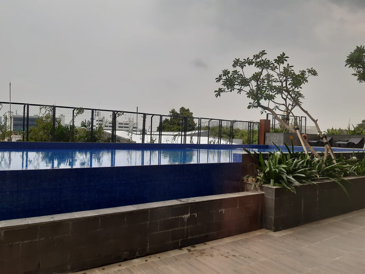 Отдохните и расслабьтесь в этом спокойном, стильном жилье в Южной Джакарте, рядом с экопарком площадью 7 гектаров. Индустриальный дизайн, роскошная квартира-студия, полностью оборудованная кухня (плита, холодильник, кофемашина Nespresso, все кухонное и обеденное оборудование), 43-дюймовый андроид-телевизор, диван, двуспальная кровать размера Queen size, ванная комната с горячим душем. К услугам гостей бассейн, джакузи, тренажерный зал и парковочное место. Из 22-го этажа открывается великолепный вид на Джакарту.