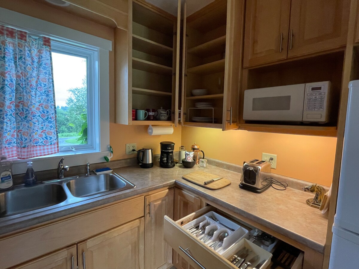 У вас есть дом в Вермонте! 5-звездочная квартира с одной спальней имеет загородное очарование и современную панахую. Идеальное место для отдыха в сельской местности, потрясающие виды, лес и поля. Все, что вам нужно: хорошо оборудованная с привлекательной, высококачественной мебелью, отдельный вход, полноценная кухня, открытая гостиная/столовая, уютная спальня с двуспальной кроватью размера Queen size. Кабельное телевидение, Wi-Fi и сотовая связь. Много бесплатных парковочных мест. Недавние гости жаловались на проблему с отоплением. Это не так. Никаких жалоб до или после.