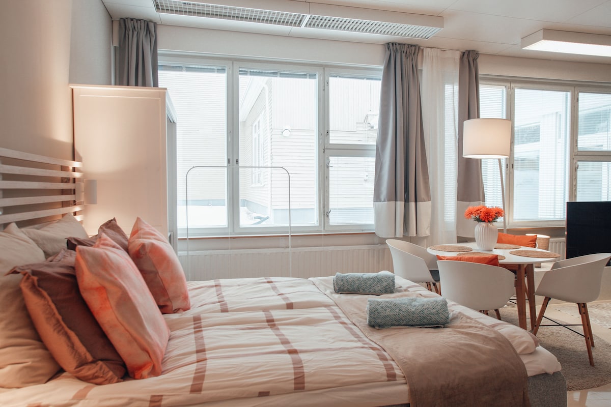 Rentoudu koko perheen kanssa tässä rauhallisessa majapaikassa. Korento on viihtyisä ja melko tilava perhehuone. Huoneessa on vuodepaikat neljälle: kaksi laadukasta parisänkyä, jotka on erotettu toisistaan yksityisyyttä lisäävillä verhoilla. Lisäksi yksi lisävuode on sohvasängyssä. Majatalossa on ilmainen kuntosali ja iso keittiö. Keittiössä on monipuoliset ruoanlaittovälineet ja astiat. Tarjoamme vieraillemme teetä ja pikkuleipiä maksutta. Korento-huoneessa ei ole omaa kylpyhuonetta.