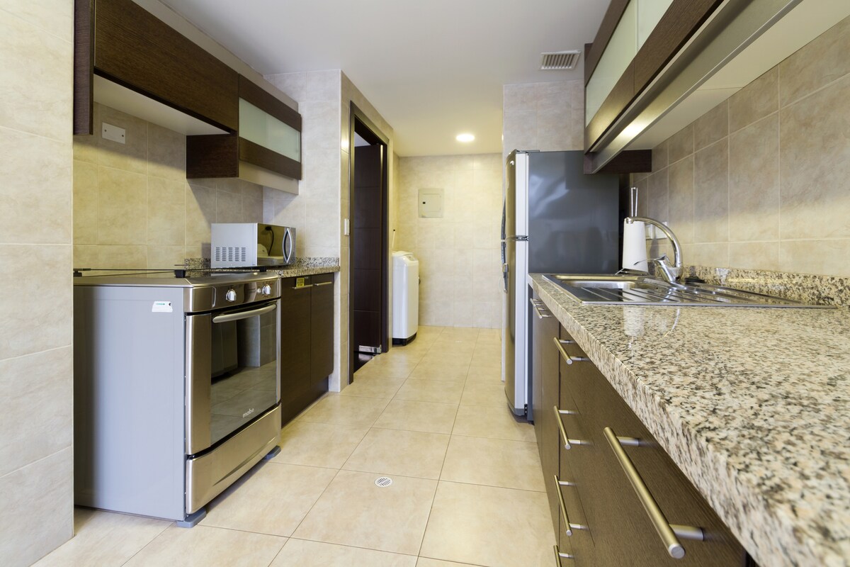 Strategically located in La Carolina Park, with a double advantage: a B2B corporate hub (steps from government ministries) and convenient access for concerts (walking distance to Atahualpa Stadium and Rumiñahui Coliseum). I provide invoices and a 24/7 check-in. Suite: 3 bedrooms, 5 beds, 2.5 bathrooms. Ideal for executives or groups. High-speed Wi-Fi (700 Mbps), hotel-quality linens, gym, parking, and 24/7 security. Base occupancy: 5 guests (+$10/night extra).