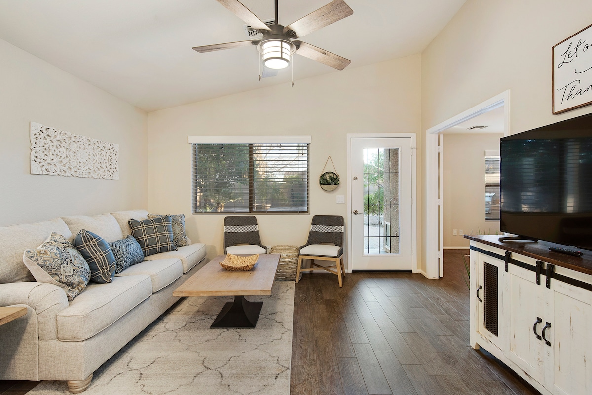 Замечательный, удобный, просторный, площадью более 2300 кв. футов Полностью меблированная SFH. Много места для отдыха с гостиной и семейной комнатой с газовым камином! Полюбуйтесь солнцем Аризоны или красивыми звездными ночами на заднем дворе в частном курортном стиле с крытым патио, игровым бассейном и газовым пожарным столом! Также включает в себя огороженный двор для ваших питомцев. Животные приветствуются! Парковка для гаража на 1 автомобиль. Отличный район! Рядом с отличными ресторанами, магазинами и доступом на автостраду. AZ TPT#21500053
