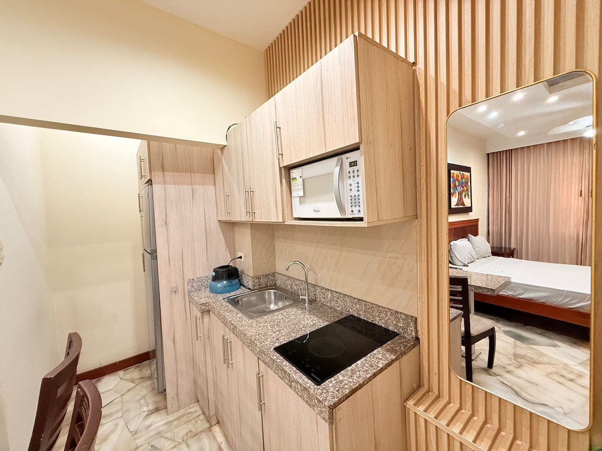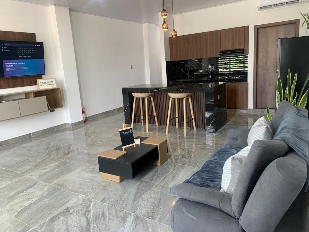 Relájate en una suite cálida y elegante pensada para parejas. Disfruta una cama amplia, iluminación suave, Smart TV gigante y una decoración en madera que crea un ambiente íntimo y relajante. La cocina está equipada para preparar algo especial, y también podrás disfrutar de la piscina y áreas exteriores tranquilas. Ubicación exclusiva en Unioro, cerca de restaurantes y zonas seguras para caminar en pareja.