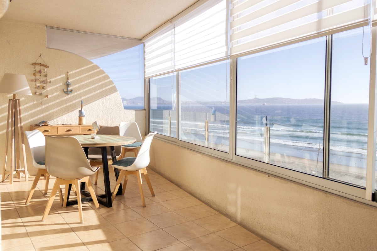 Escapate frente al mar con tu familia. En cualquier época del año, sientete como si estuvieras en tu hogar. Atardeceres desde la terraza, donde se ve toda la bahía de coquimbo y la serena. En las noches cielos despejados y estrellados, respirando el aire marino. Todo esto frente del mar, piso 19, para 5 personas. A un costado del casino Enjoy. piscina al aire libre y vista al infinito. Kinchos Con vista panoramica. Estacionamiento gratis. Saliendo del condominio avenida costanera
