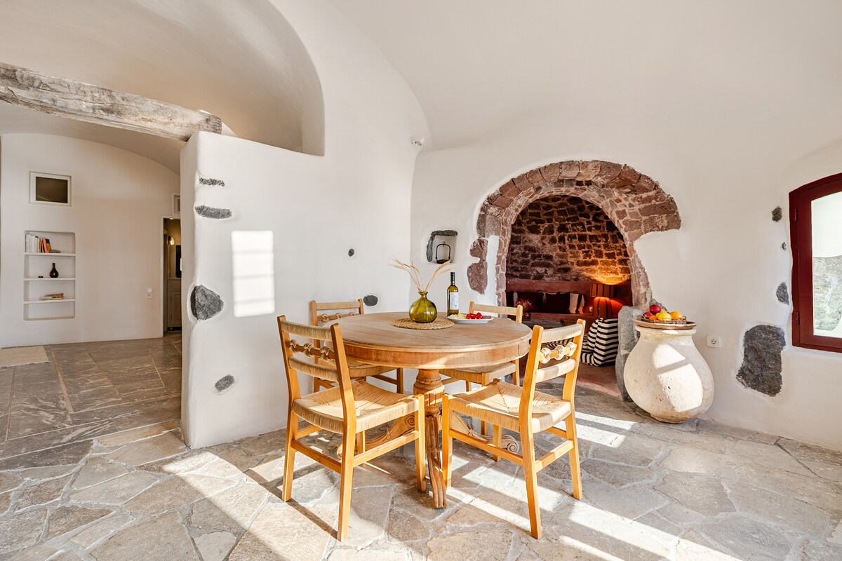 Старая пекарня деревни находится всего в двух минутах от центральной площади Ойи, с отдельным входом прямо на лестнице, ведущей к заливу Армени. Вырезанный в горах с уважением к уникальной местной архитектуре и в гармонии с залитой солнцем, дикой вулканической красотой, недавно отреставрированный пещерный дом хранит истории о традициях, наследии и стиле. Камни красного пумиса, антикварные мраморные полы и деревянная мебель ручной работы создают ощущение подлинного теплого гостеприимства.