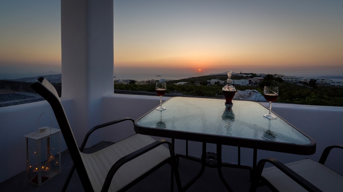 A wonderful two bedroom Villa with its private balcony and communal huge terraces. It belongs to a complex of 3 independent houses. A breathtaking view to the Aegean Sea and the sunset directly from the living room and double bedroom. KALLISTI accommodates 3 people. It has its own little kitchen area to prepare a light meal, plus a modernized minimal high ceiling shower bathroom. 10 min walk to famous Oia and 1 min walk to the main road, bus stop and to the restaurants.