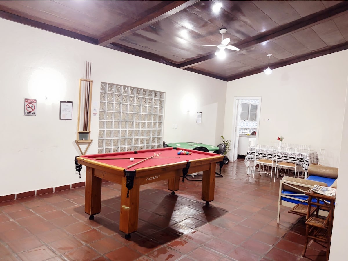 Рядом пляж (~600 м), Temptation Bakery (~300 м) и Hotel Jequitimar/ Shopping/ Pão de Açucar (~350 м). ""Wifi 50Mb - Vivo Fiber Optic (мощный)"" Casa Térrea Tall с потолочными вентиляторами Широкая терраса с гамаками в садах Вакансии на 02 машины Телевизор с грилем для барбекю (кабельное телевидение)/микроволны/плита/холодильник / кофеварка /электрическая духовка - новинка Можно с ПИТОМЦАМИ