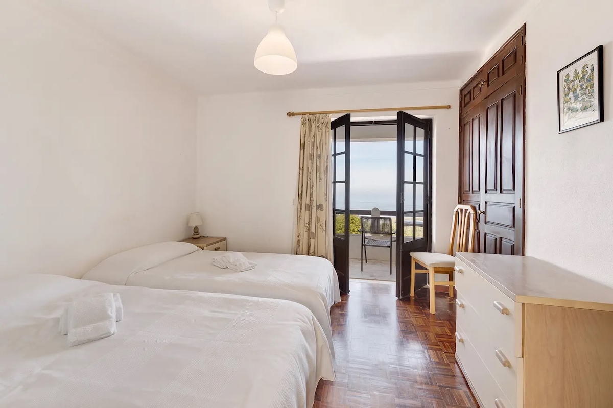 Квартира с 1 спальней и 2 односпальными кроватями, собственной ванной комнатой, балконом с видом на открытое море, рабочим местом и оборудованной кухней. Бассейн и сад общего пользования. Контакт с природой, спокойной атмосферой и свежим воздухом. До Прайя-Гранде (серфинг) Парковка на территории. Если вы ищете жилье для 4 человек, также ознакомьтесь с объявлением двухместной комнаты № 2, который находится рядом с этой квартирой.