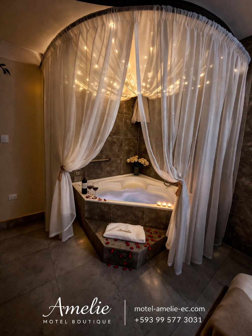 Откройте для себя другие впечатления в люксе Amelie, предназначенном для пар, ищущих уединение, комфорт и уникальную атмосферу. В каждой комнате есть свой тематический стиль и детали, предназначенные для создания особой ночи. Во время вашего пребывания вы можете пользоваться собственным джакузи, горячей водой, Smart TV с доступом в Интернет, мини-баром и вкусным меню. Кроме того, вы можете дополнить свой визит массажем. Идеально подходит для юбилеев, романтических поездок или незабываемых моментов для пар.