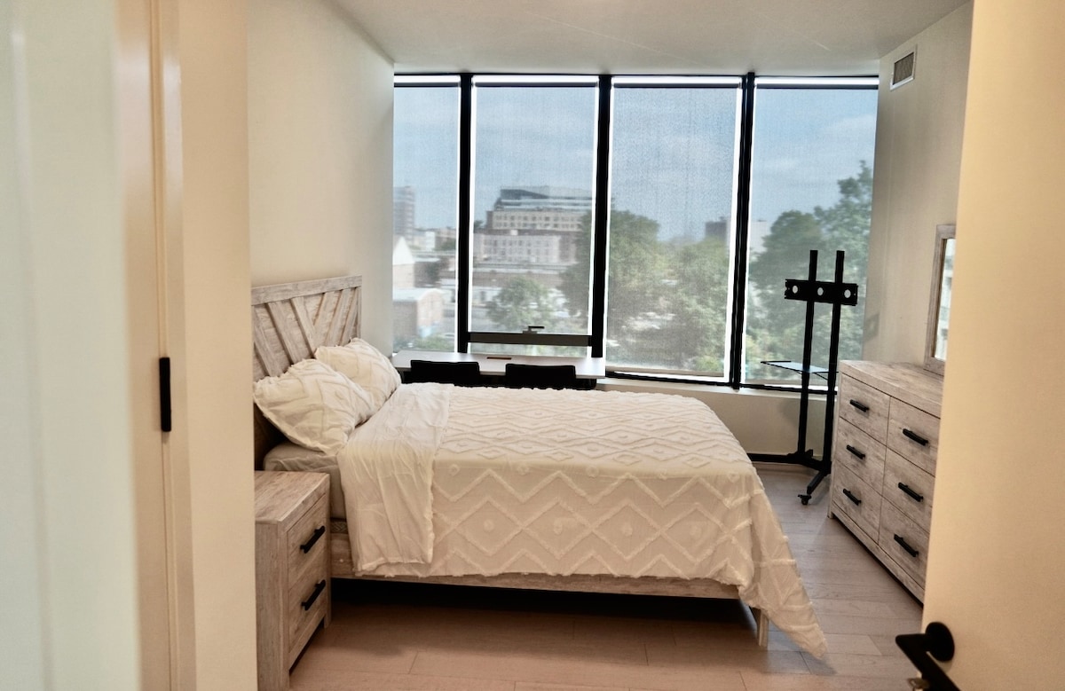Отдельная спальня с двуспальной кроватью размера Queen size и мини-холодильником. Рядом со всем необходимым, в 5 минутах ходьбы от аэропорта Ньюарка, в нескольких минутах ходьбы от железнодорожного вокзала, который идет прямо в Нью-Йорк, а также местных ресторанов и кондитерских. Общее пространство включает гостиную, столовую и кухню, оборудованную кофе, кофемашиной, микроволновой печью, холодильником и духовкой.