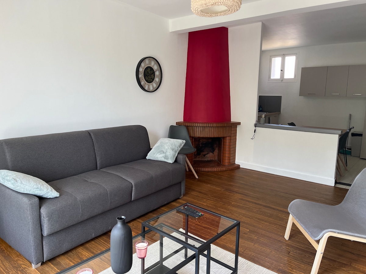 Bienvenue dans la « BootFamily » grande et belle suite au deuxième étage de notre maison, d’environ 35m2 mansardée et joliment décoré pouvant accueillir un ou deux voyageur(s) (un seul couchage). Vous trouverez en entrant un coin nuit ainsi qu’un coin détente (canapé, TV, table basse transformable en table à manger). Vous aurez également un bureau pour travailler avec accès wi-fi. Et dans une seconde pièce, une salle de bain, un coin cuisine (plaque électrique, frigo, cafetiere,..) et WC séparé