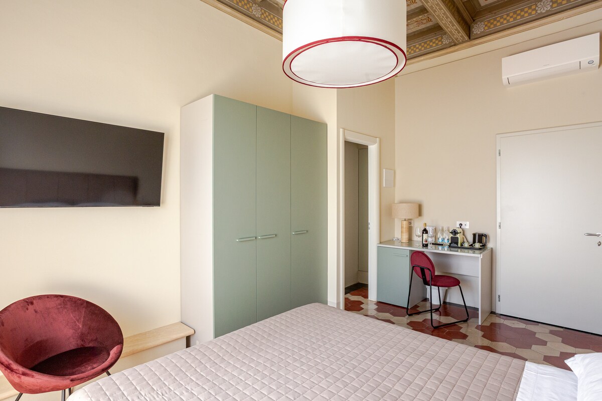 Погрузитесь в изысканный комфорт в нашем элегантном номере в San Prospero Heritage. Наслаждайтесь просторной, светлой комнатой с двуспальной кроватью размера King size, дизайнерской мебелью и роскошной ванной комнатой, отделанной травертином. Оставайтесь на связи с быст помощью быстрого Wi-Fi, расслабляйтесь с Netflix на телевизоре Smart TV и наслаждайтесь беспроблемным самостоятельным заселением. Расположен в очаровательном здании в стиле модерн, всего в нескольких минутах ходьбы от исторического центра Сиены. Прямо перед отелем есть много парковочных мест. Второй этаж без лифта