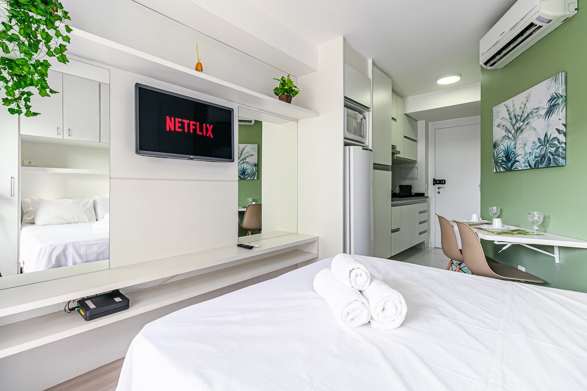 Bem-vindo ao nosso encantador estúdio, inspirado no estilo provençal, onde a elegância se encontra com a praticidade. Relaxe em uma confortável cama de casal, conecte-se facilmente com nosso Wi-Fi , e desfrute de temperaturas agradáveis com o ar condicionado. Para garantir noites tranquilas, a porta antirruído oferece um ambiente sereno. Sinta-se em casa na cozinha completa, ideal para preparar suas refeições favoritas, e aproveite a atmosfera ao ar livre na varanda privativa.