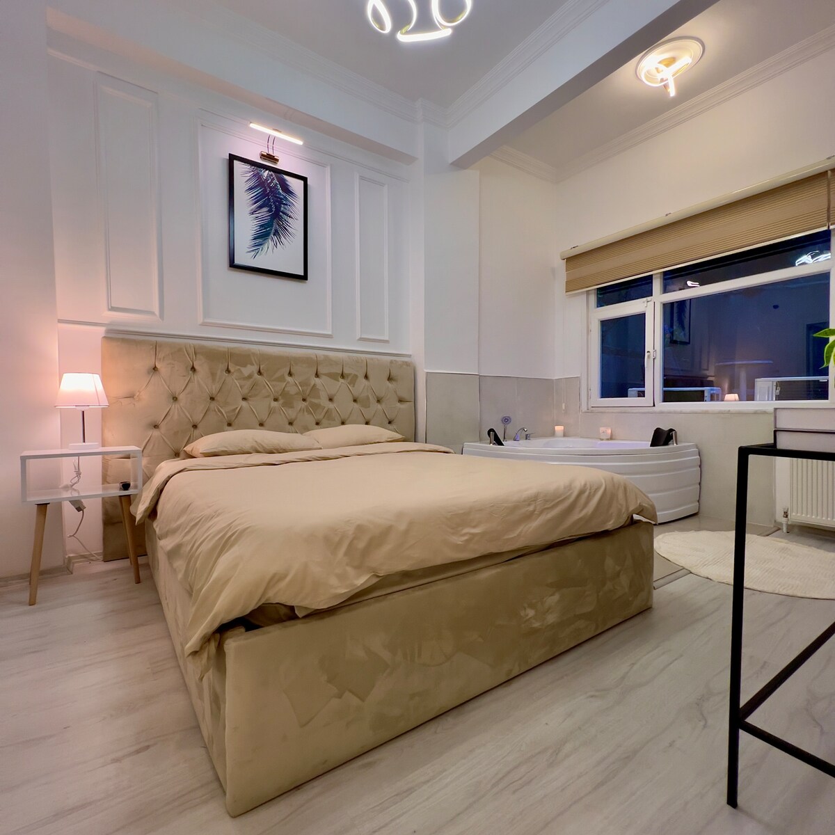 This special apartment is a beautiful travel address where you can feel at home and stay in peace and comfort with its elegant design, spacious and central location. Room with private jacuzzi, 2 bathrooms, 2 toilets, 3 bedrooms, work area, netflix, coffee machine and equipped kitchenware. It is 2 minutes away from the metro, Istiklal street and Galata tower. There are many restaurants, pharmacies, cafes, markets and shops around. Despite its central location, it is on a quiet street.
