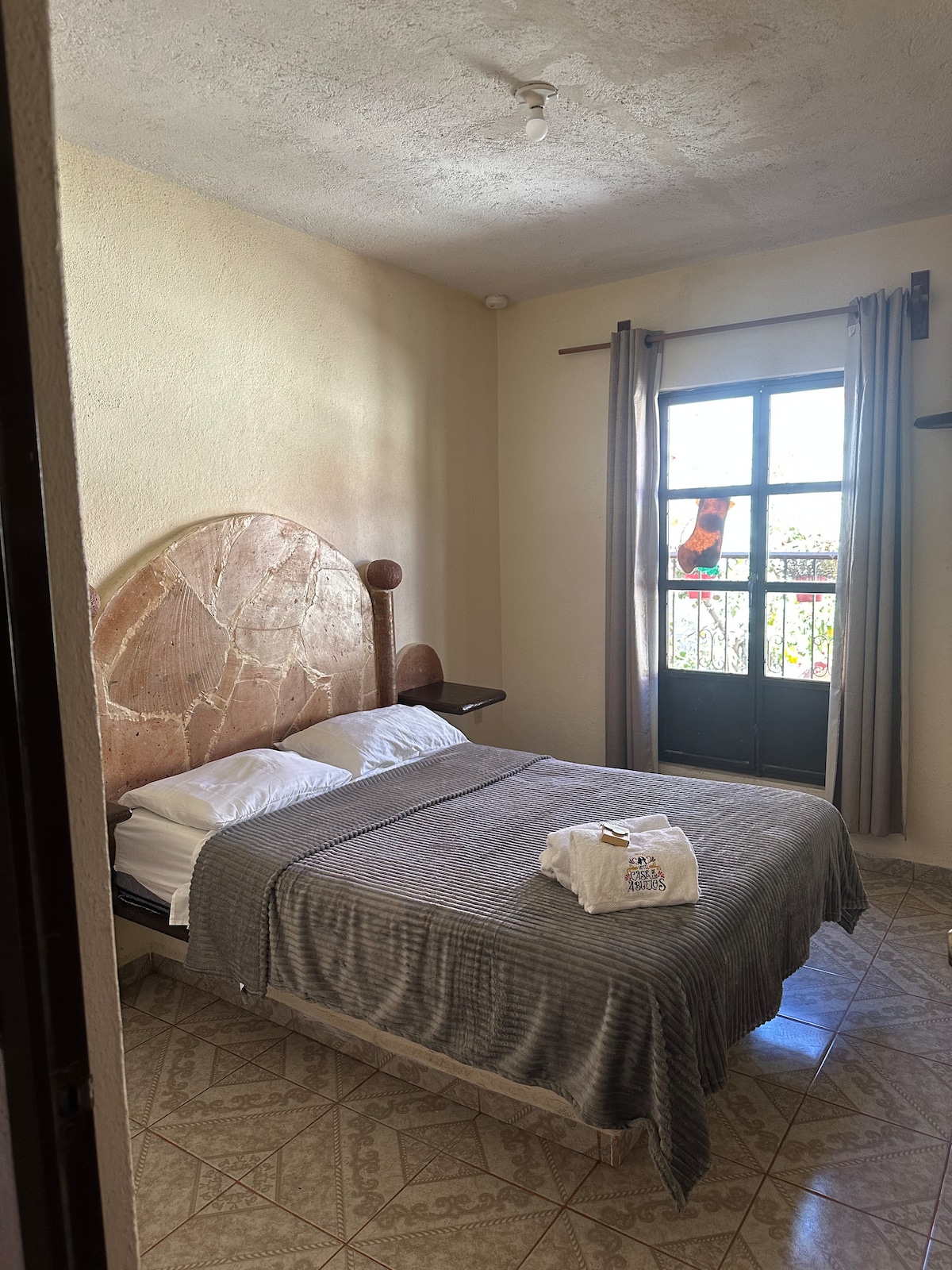 El es una recamara con bardas de piedra que la hacen fresca pero a la vez tibia, es también silenciosa con todo y que da a la calle. Se duerme muy bien. Tiene techo de catalana muy alto. TV y Refrigerador Cuenta con servicios básicos, wifi, café y té. Para 5 personas a espaldas del templo principal y a cuadra y media del centro de la ciudad.
