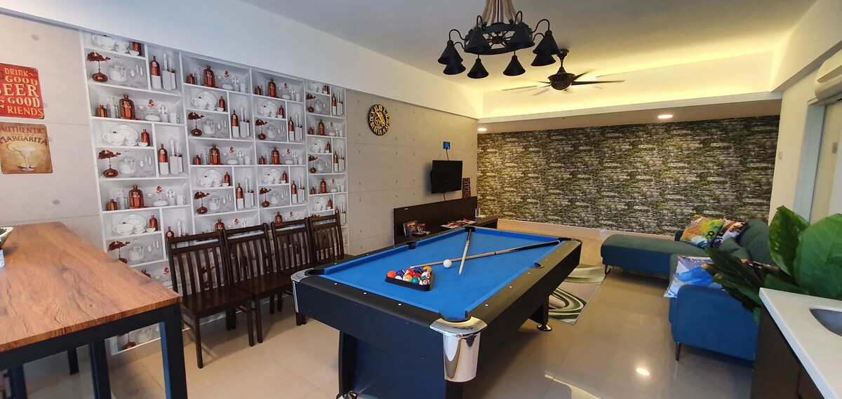 StarSuiteAC — роскошное жилье над облаками! Роскошно оформленный дуплекс на высоком этаже с захватывающим видом на горизонт КЛ. Отдохните под звездным небом и насладитесь незабываемым отпуском! Насладитесь звукоизолированной караоке-комнатой, бильярдом и аэрохоккеем, а также домашним кинотеатром с объемным звуком для настоящего кинопросмотра. Удобства: кухня, холодильник, микроволновая печь, рисоварка, аэрофритюрница, фильтр для воды, стиральная машина (с сушилкой), массажное кресло и т. д.