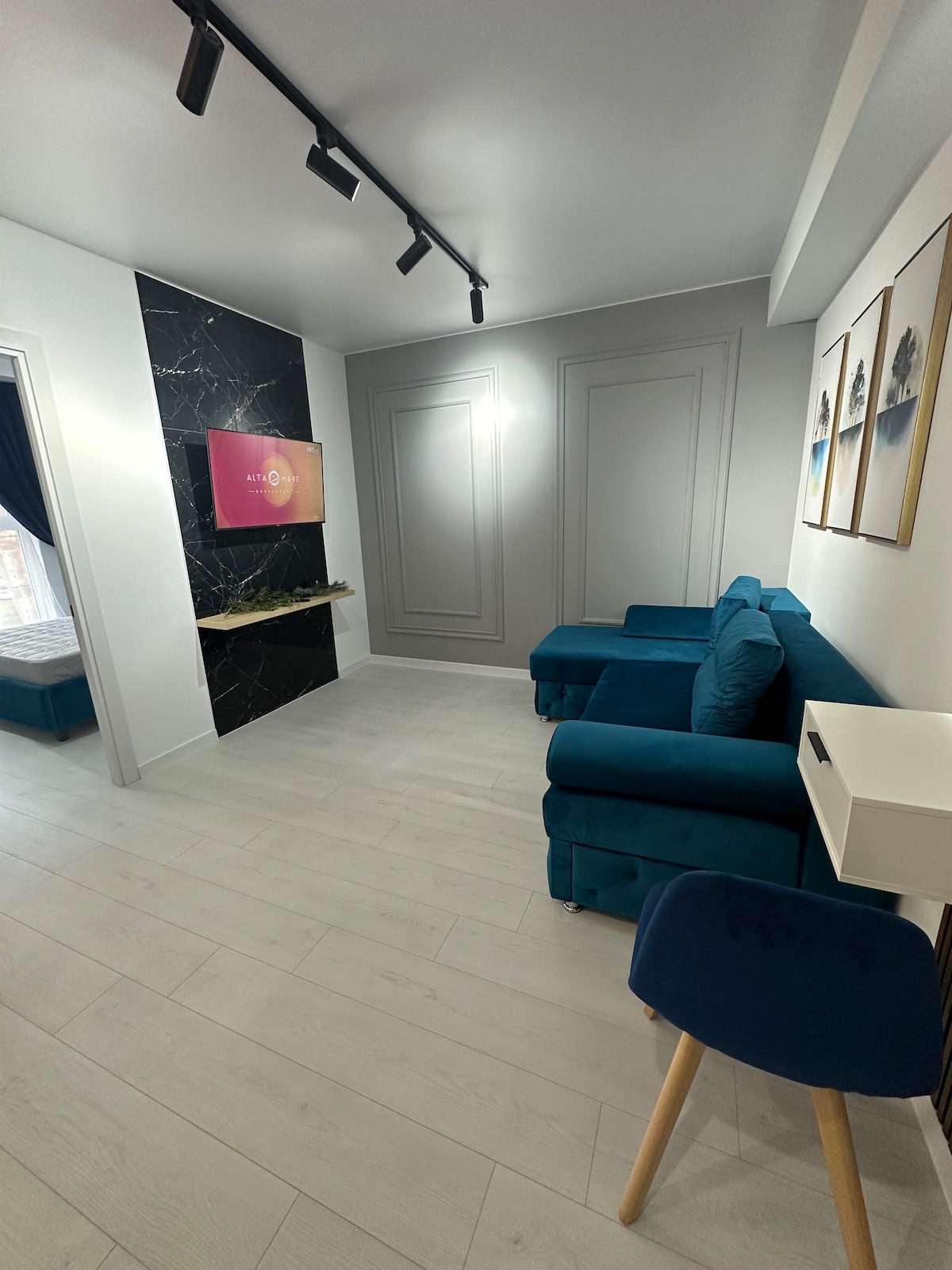 Apartament cu design modern și atmosferă premium, amenajat cu atenție la fiecare detaliu. Iluminat elegant, mobilier confortabil și un colț de lucru cochet creează un spațiu ideal atât pentru relaxare, cât și pentru șederi business. O locuință intimă, stilată și perfectă pentru o experiență diferită de un simplu sej