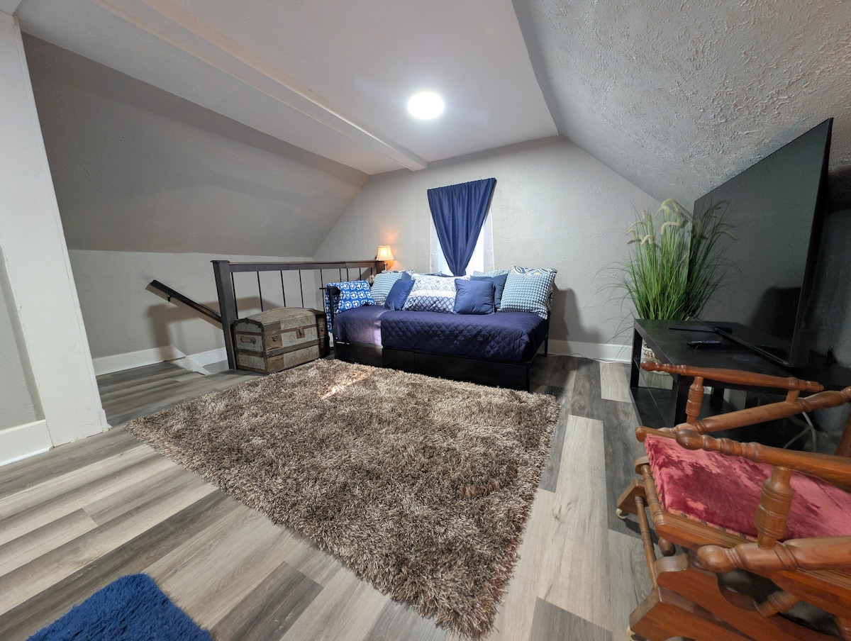 Уютная, богемная, двухэтажная частная квартира расположена на причудливой главной улице Голубой Земли. Удобно расположен рядом с I-90 и Hwy 169. В пешей доступности от продуктового магазина, специализированных магазинов, кафе/мороженого, парков, церквей и бассейна. Отдельный вход, одна спальня, небольшая ванная комната, полностью оборудованная кухня, столовая, уютная гостиная с окном с видом на главную улицу. Обратите внимание, что существует вероятность шума. Комфортно спит трое взрослых. Идеально подходит для семьи из четырех человек.