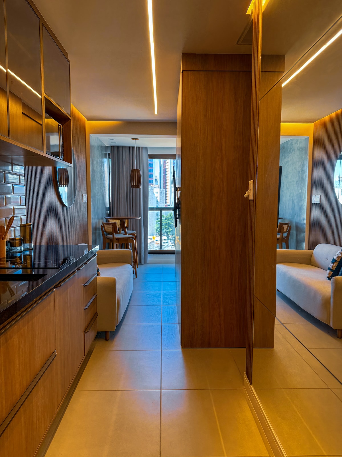 Изысканный лофт с потрясающим видом на море. Уютное жилье расположено в Smart Farol da Barra, в одном квартале от пляжа Farol da Barra, в центре карнавального маршрута Сальвадора. Он находится недалеко от Morro do Cristo, Praia do Porto da Barra, Shopping Barra, но в основном до Farol da Barra, который находится в 5 минутах ходьбы. В кондоминиуме есть хорошо оборудованный тренажерный зал, зал для вечеринок, коворкинг, прачечная самообслуживания и бассейн на крыше.