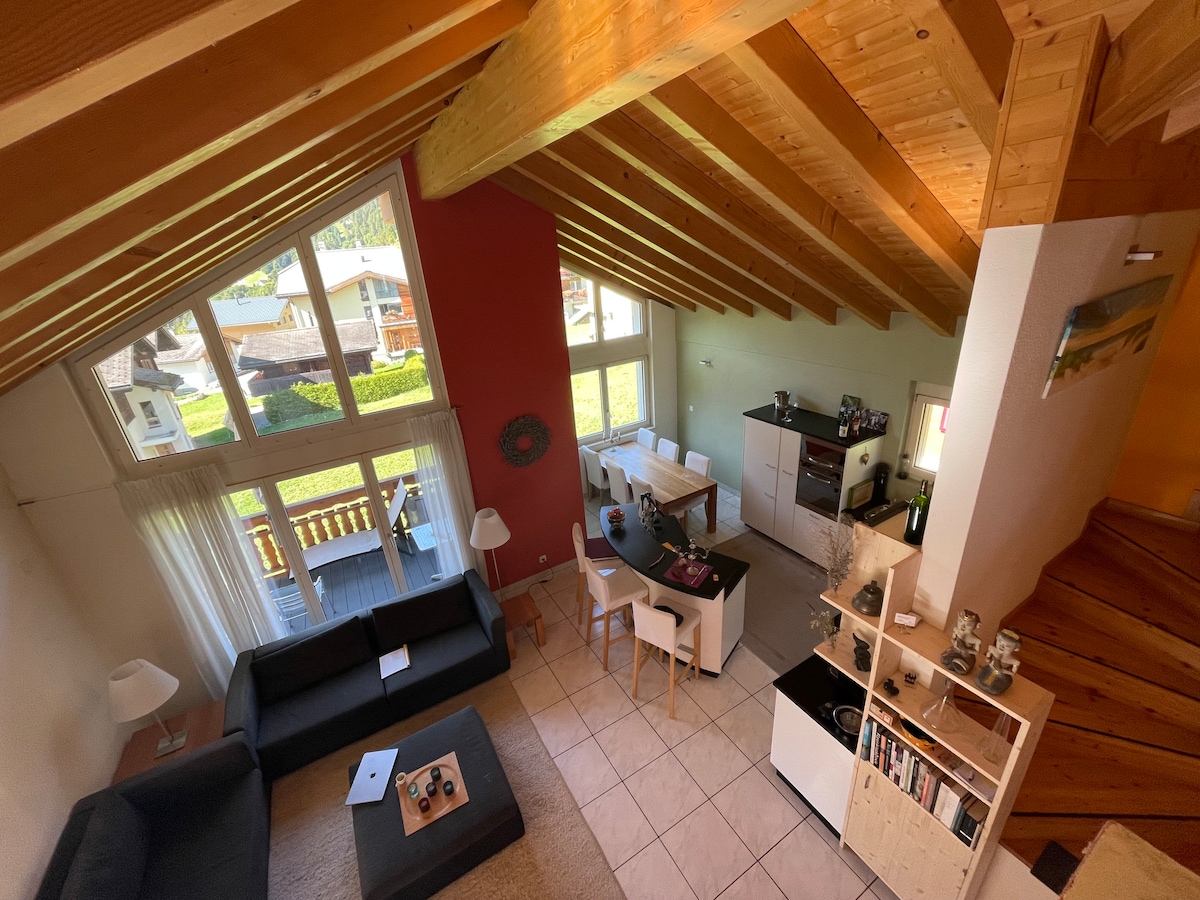 Пентхаус с террасой площадью 100 кв. м, видом на Альпы и ЧАСТНАЯ гидромассажная ванна. Внутреннее пространство, состоящее из открытой гостиной и столовой с раскладной кроватью (180 см), телевизором с большим экраном, полностью оборудованной ванной и уютным офисом. На кухне есть все, что вам нужно. Снаружи терраса и виды ждут вас. Обеденный стол на открытом воздухе, гамак и чаша для костра приглашают расслабиться. Рядом с канатными дорогами Gemmi и Torrant и термальными ваннами.