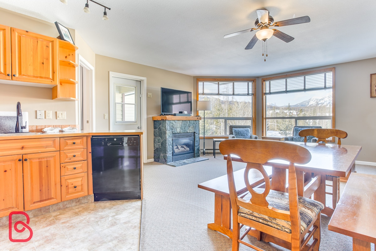 Stylish, True Ski In/Out. Top Floor 1-bedroom condo in Cornerstone Lodge, overlooking the plaza. The Lodge is closest to ALL base lifts at FAR. Ideal for couple/single/small family with a king bed. This is our unit, so we have set it up for our use. The kitchen for cooking, with good knifes and cookware and 4 types of coffee makers. The building features secure heated underground parking, hot tub, gym, ski locker and in the underground garage. Perfect for a convenient stay. Steps to Ski's on.