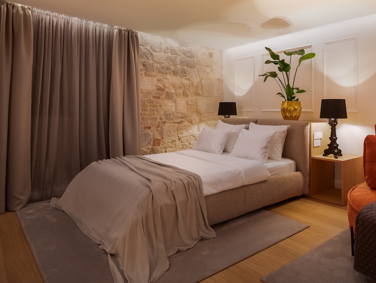 Просыпайтесь под открытыми балками старинных деревянных потолков. Будьте очарованы антикварными штрихами, промышленной лестницей и изысканной отделкой, расположенной за огромными внутренними каменными арками Императорского дворца. Погрузившись в историю, выпейте бокал вина с балкона этого уникального лофта после знакомства со Сплитом, где экспонаты музея украшают палитру песка и приглушенных земляных оттенков.