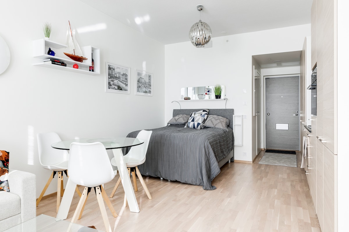 В этом современном лофте на 7-м этаже есть все для комфортного пребывания в самом модном районе Хельсинки. - Построено в 2021 году. - современная кухня и ванная со стиральной и сушильной машинами; - высота комнаты - 4,3 м. - 2 балкона в французском стиле. - бесплатный Wi-Fi; - 5 минут от метро; Рядом с оживленным Теурастамо (Meatpacking district) и станцией метро Kalasatama/торговым центром Redi с ресторанами, фирменными магазинами и услугами. Удобно для внутренних и международных поездок. Полностью оборудована для длительного проживания. Кровати до 4-х человек.