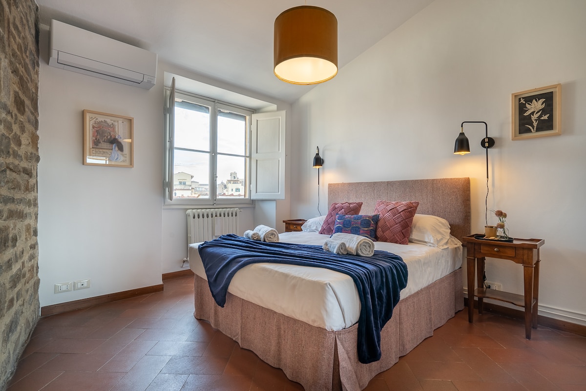 Люкс площадью около 592 квадратных футов с широкой гостиной и прекрасным балконом с видом на реку Арно. Из окон открывается потрясающий вид на Понте Веккьо, а также на Понте Санта Тринита. В гостиной есть обеденная зона и полностью оборудованная кухня. В спальне есть двуспальная кровать размера Queen size и 2 шкафа. Большая ванная комната с 2 окнами, двойной раковиной и душевой кабиной соединена со спальней. Предоставляются Wi-Fi и система кондиционирования воздуха.