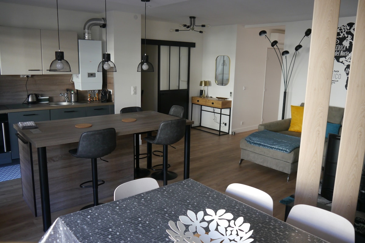 Двухкомнатная квартира с кроватью 160 см, просторной спальней, большой ванной комнатой и полностью оборудованной кухней, большим телевизором и удобным диваном, все в тихом районе с парковкой! Насладитесь лоджией, чтобы попить на террасе. Есть парковка для вашего автомобиля, а также электрическая, с зарядной розеткой или для велосипедов. До скорой встречи в моем маленьком коконе Экссуа!