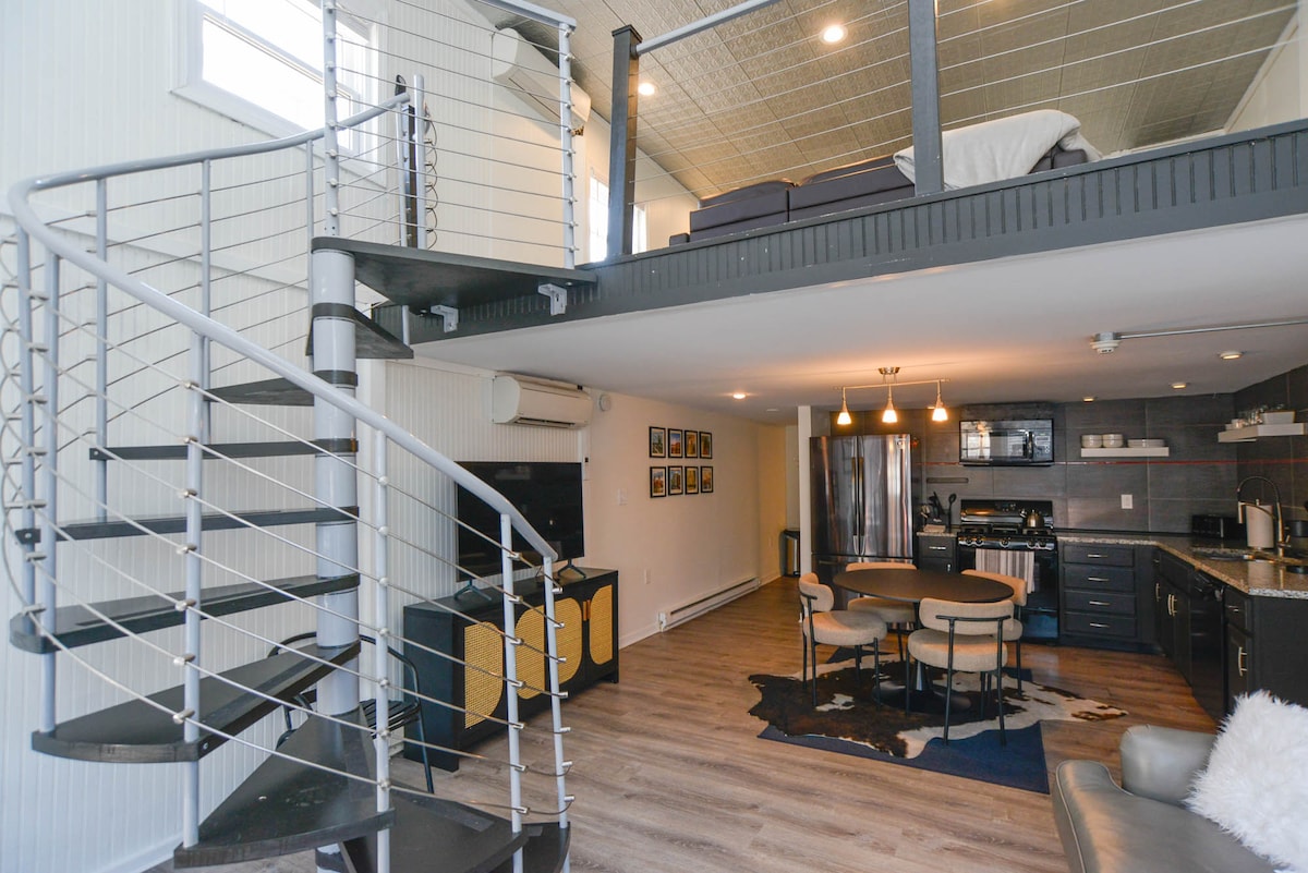Расслабьтесь и остановитесь в этой модной стильной квартире верхнего уровня. В этой квартире есть большая спальня с прачечной в номере и просторная ванная комната с огромной ванной и душем (струи не работают). Жилое пространство также очень просторное с открытой планировкой в большую обеденную зону. Наш диван-кровать также является полноценной кроватью! Вы можете поужинать с полностью укомплектованной кухней и развлечься с друзьями. Мы находимся всего в нескольких минутах от центра города, если посещение ресторана кажется более желательным!