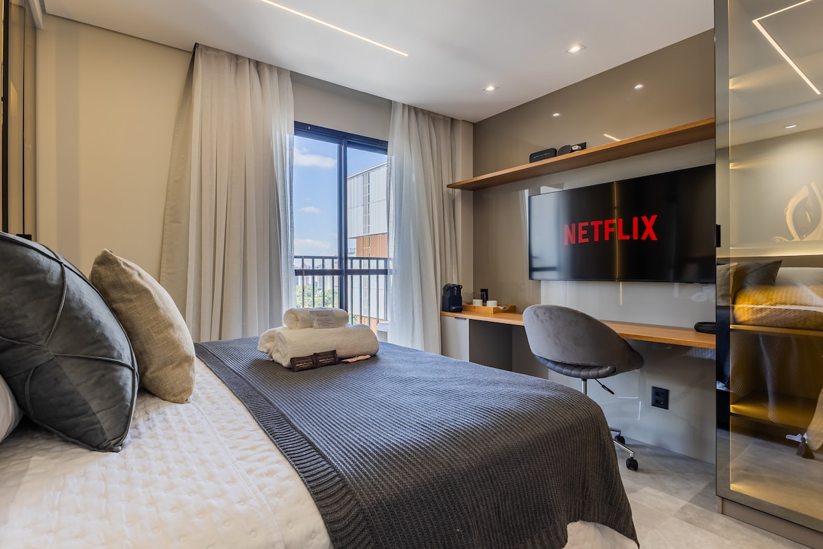 Стильная и уютная студия в 250 м от проспекта Фариа Лима и в 500 м от метро. Идеально подходит для пар, деловых путешественников или тех, кто хочет насладиться Сан-Паулу с комфортом и стилем. Быстрый Wi-Fi, рабочий стол, кондиционер и полноценная кухня. В здании есть круглосуточная охрана, хорошо оборудованный тренажерный зал и современная прачечная. Легкое прибытие с умным замком. Вокруг кафе, бары, рестораны, магазины и торговые центры. Нет парковки на территории, но есть общественные парковки поблизости. Курение и проживание с домашними животными не допускаются.