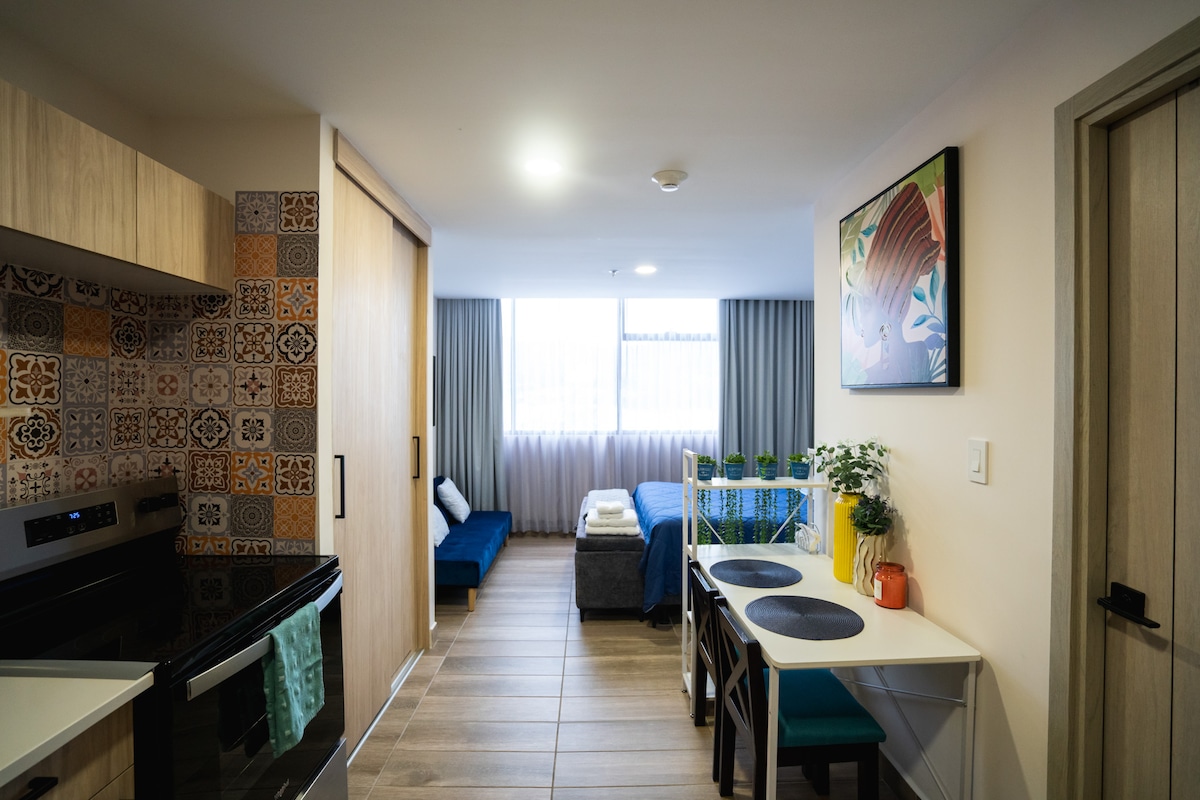 Желаем приятно провести время в EcoDistrito 307, на кольцевой дороге Периферико и перед EcoPlaza (магазины, рестораны и супермаркет). Современные апартаменты с кондиционером, Wi-Fi, Netflix, Amazon Prime и HBO Max, частной парковкой и видом на базилику Суяпа. Отлично подходит для 2 взрослых и 1 ребенка. Тренажерный зал🏋️, корт для пиклбола🏓, киоски, зона гриля🔥 (за дополнительную плату), конференц-зал и прачечная. 10 📍 минут от Мультиплазы, 25 минут от Санта-Люсии и 35 минут от Валье-де-Анхелес. Комфорт, расположение и стиль!
