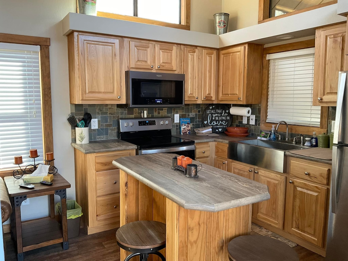 Этот уникальный микродом в прерии подарит воспоминания на всю жизнь. Этот совершенно новый домик в деревне включает в себя полностью оборудованную кухню, ванную комнату, одну спальню с кроватью размера Queen size на первом этаже и три кровати — одну кровать размера Queen size и две односпальные — в открытой зоне лофта. Этот романтический лофт имеет потолок высотой 4 фута в центре с мансардами с обеих сторон. В гостиной на первом этаже есть диван-кровать размера Queen size. Проведите время, наслаждаясь деревенским воздухом на нашем большом крыльце.