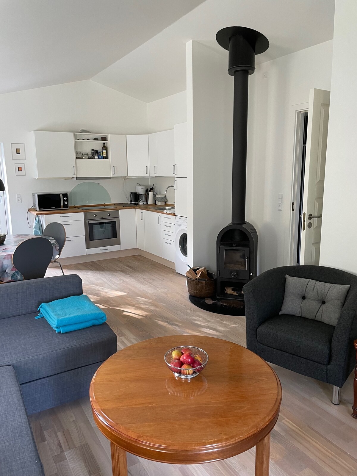 Уютная однокомнатная квартира-студия с отдельным входом. Светлая, просторная комната площадью 30 кв. м, отделанная плиткой, с открытыми балками, а также просторный вестибюль с гардеробом. Отдельный туалет и ванная. Подогрев пола по всей квартире. Мини-кухня с посудой, холодильником (без морозильной камеры), микроволновой печью, аэрофритюрницей и электрическим чайником. Парковка прямо за дверью. Небольшой садовый стол с двумя стульями между клумбами и вечерним солнцем. Дом расположен на главной улице Сорё в зоне 40 км/ч.