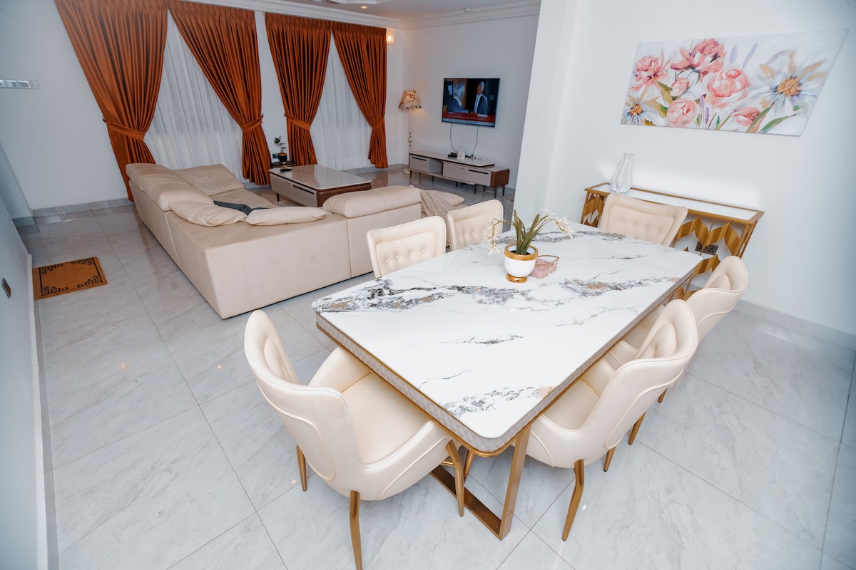 Отдохните всей семьей в этом тихом месте. Полностью меблирована для самостоятельного приготовления пищи. DSTV + Wi-Fi + Smart TV Есть резервный генератор на случай отключения электроэнергии. В квартире в квартире Электрические ворота Просторная парковка Электрический забор. Красивая зеленая трава. Смотритель в режиме ожидания Рядом с тренажерным залом и другими удобствами, включая торговый центр Palace Mall Papaya и KFC. Также 15 минут до торгового центра Main Accra Mall.