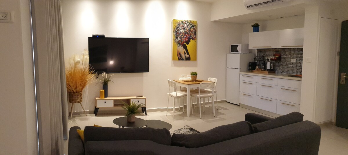 Bright and spacious 1-room apartment in Neve Yosef, Haifa. Perfect for families, couples, students, or business travelers — up to 2 guests. Fully equipped for a comfortable stay with Wi-Fi, air conditioning, kitchen, washing machine, and free parking.