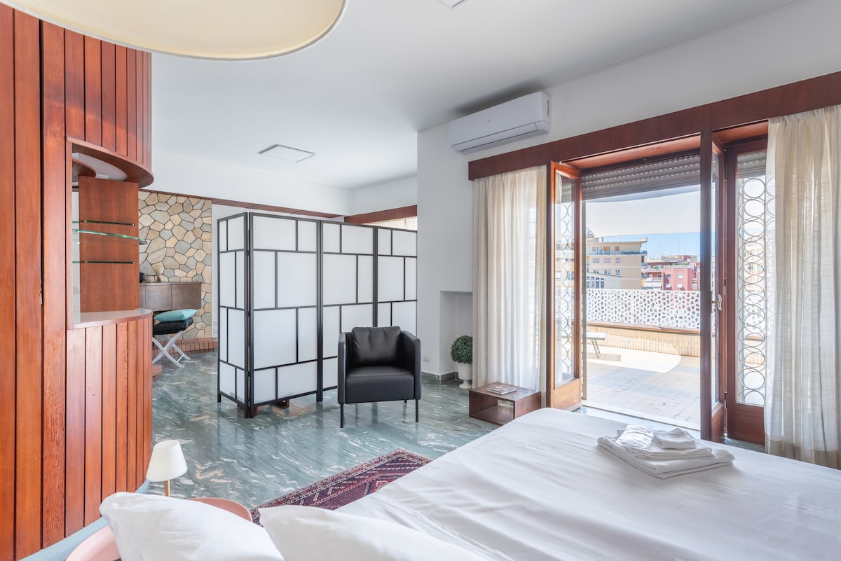Расположенная на последнем этаже старого дворца Палаццо в центре Древнего Рима, роскошь Аттикуса идеально подходит для пар, одиночек или друзей. Эта элегантная студия превосходит все удобства, которые вы ожидаете получить в 5-звездочном отеле: здесь вас ждут просекко, предметы для завтрака и туалетные принадлежности Сальваторе Феррагамо. Комфорт, элегантность и уединение для удивительного пребывания в нескольких минутах ходьбы от Колизея и Форум Траяна. Романтика также с бокалом вина на балконе с видом на центр города и Римский форум со своей стороны.