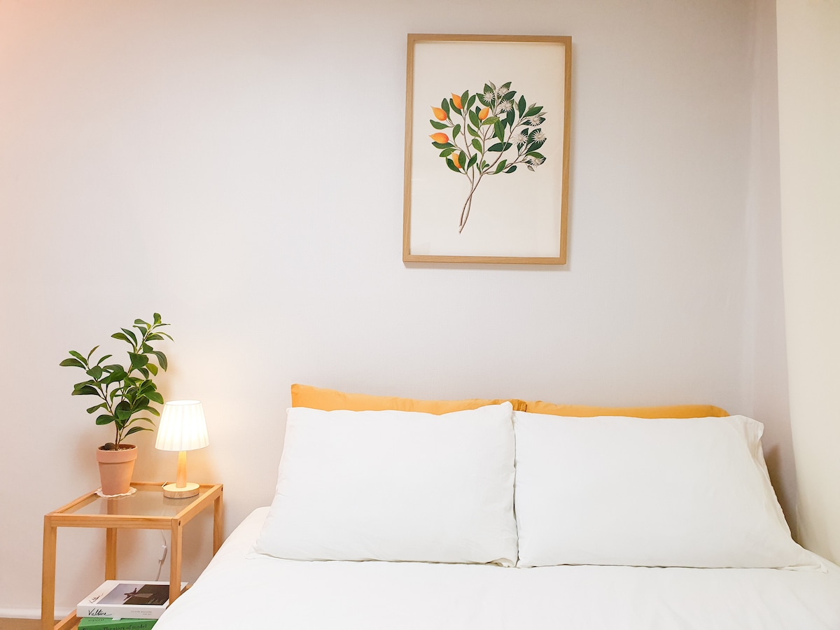 ❤️Оставьте проблемы позади в солнечной, спокойной и стильной обстановке. 2 спальни + 1 ванная комната + гостиная + кухня + прачечная. 2 кровати (кровать размера Queen size) В номере есть стиральная машина, сушилка. Для 5 человек (Диван-кровать, дополнительные одеяла + подушки) 1 минута ходьбы, парковка доступна (за дополнительную плату). Пожалуйста, свяжитесь с нами. Доступно 🎈 по предварительному бронированию.🎈