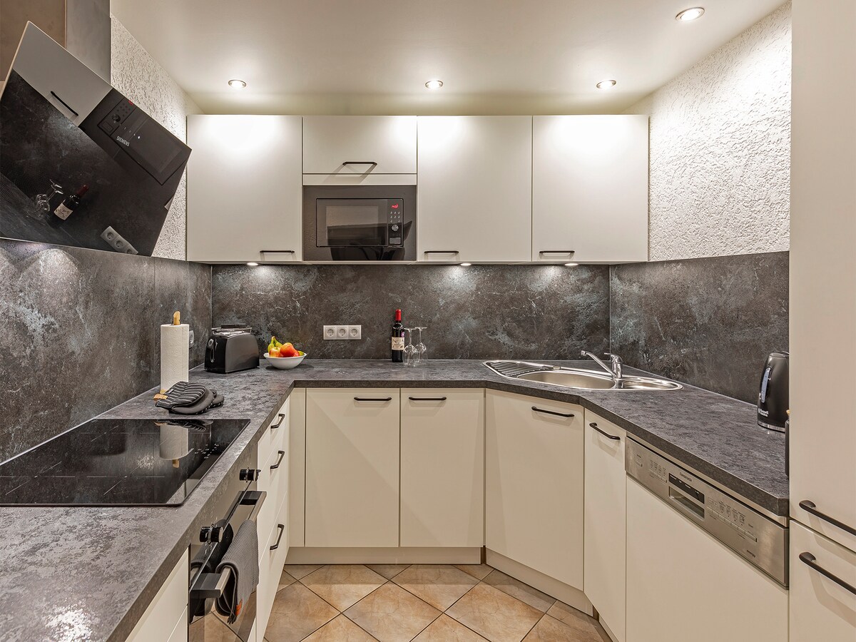 Меблированная двухкомнатная квартира со стильным интерьером по современному стандарту (2022 год): Полностью оборудованная кухня, обеденная зона, диван с функцией кровати, телевизор, оптоволоконный Wi-Fi, двуспальная кровать, ванная комната с душем/туалетом, кладовая, подогрев пола, электрические жалюзи. Кроме того, в квартире есть небольшая терраса с сиденьями в саду (будут посажены).