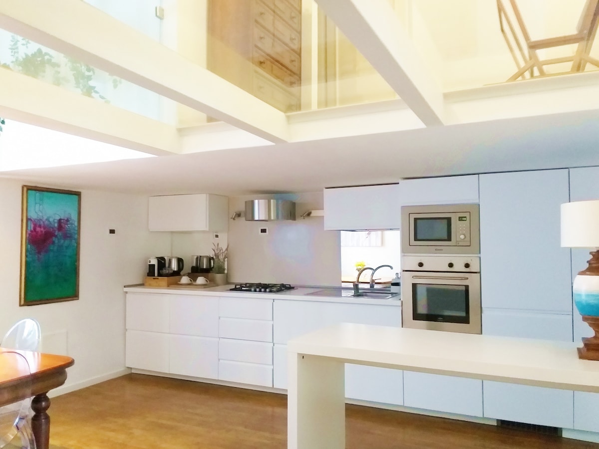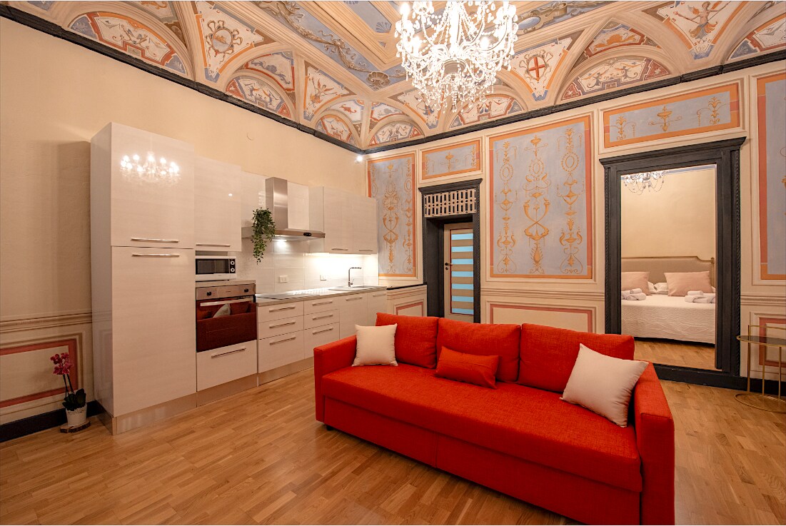 Элегантная и светлая квартира. Окна выходят на центральную площадь Пьяцца Маттотти Напротив знаменитого дворца Дюкале, состоящего из: -1 отдельная гостиная открытого типа с удобным диваном-кроватью и высоким потолком. -1 роскошная обеденная зона с дизайнерским столом и стульями. -1 современная кухня со всеми удобствами. -1 спальня с двуспальной кроватью, расположенная на антресоли с видом на гостиную. также подсвечены 3 величественными окнами -1 современная ванная комната со стеклянным душем.