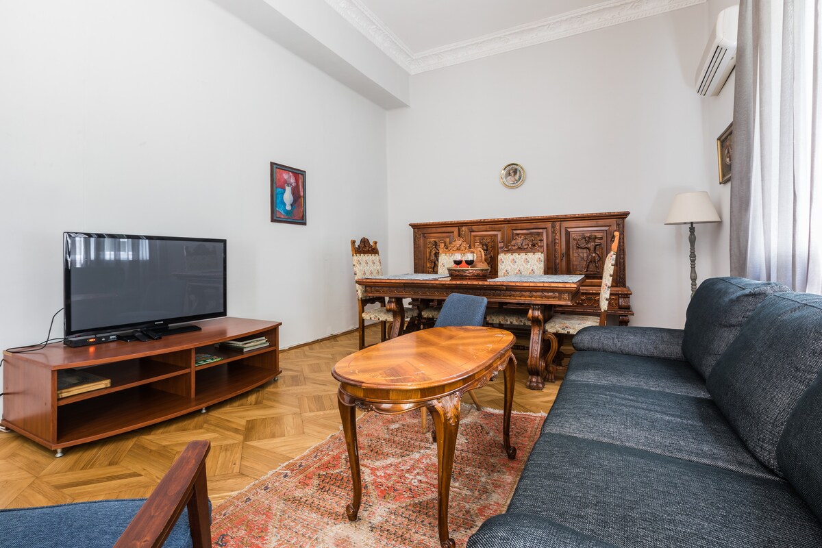 Квартира расположена в старом Тбилиси, в туристическом районе. В одной из четырех спален есть балкон с видом на одно из самых популярных туристических направлений города - Новый Тифлис (восстановленный старый район Тбилиси, который был построен немецкими колонизаторами двести лет назад). Это тихое место, а улица закрыта для движения транспорта. Отлично подходит, чтобы прогуляться пешком и рассмотреть двухсотлетнюю архитектуру. Рядом много тихих кафе и кальянных баров.