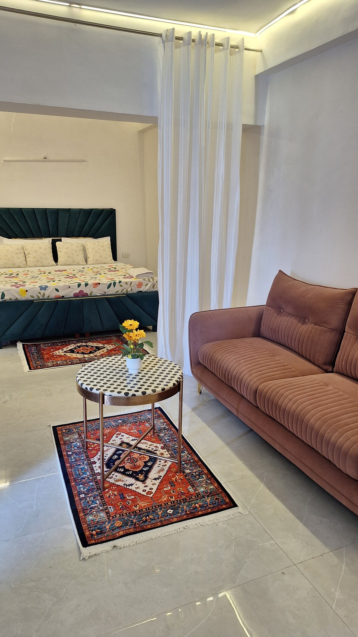 Harmony Luxe Suite: Premium Studios in City-Center Market. Sleek, Top-floor studio, just a few-min walk to major showrooms & transport. Experience luxury with 32inch LED, plus a fully equipped kitchen. Sleep soundly on a 8" mattress. Warm LED lighting, silent fan, plush sofa, and beige tiles create a refined ambiance. Enjoy private, self access and CCTV security. Ideal for couples & travelers seeking comfort and convenience. Book your premium stay now!