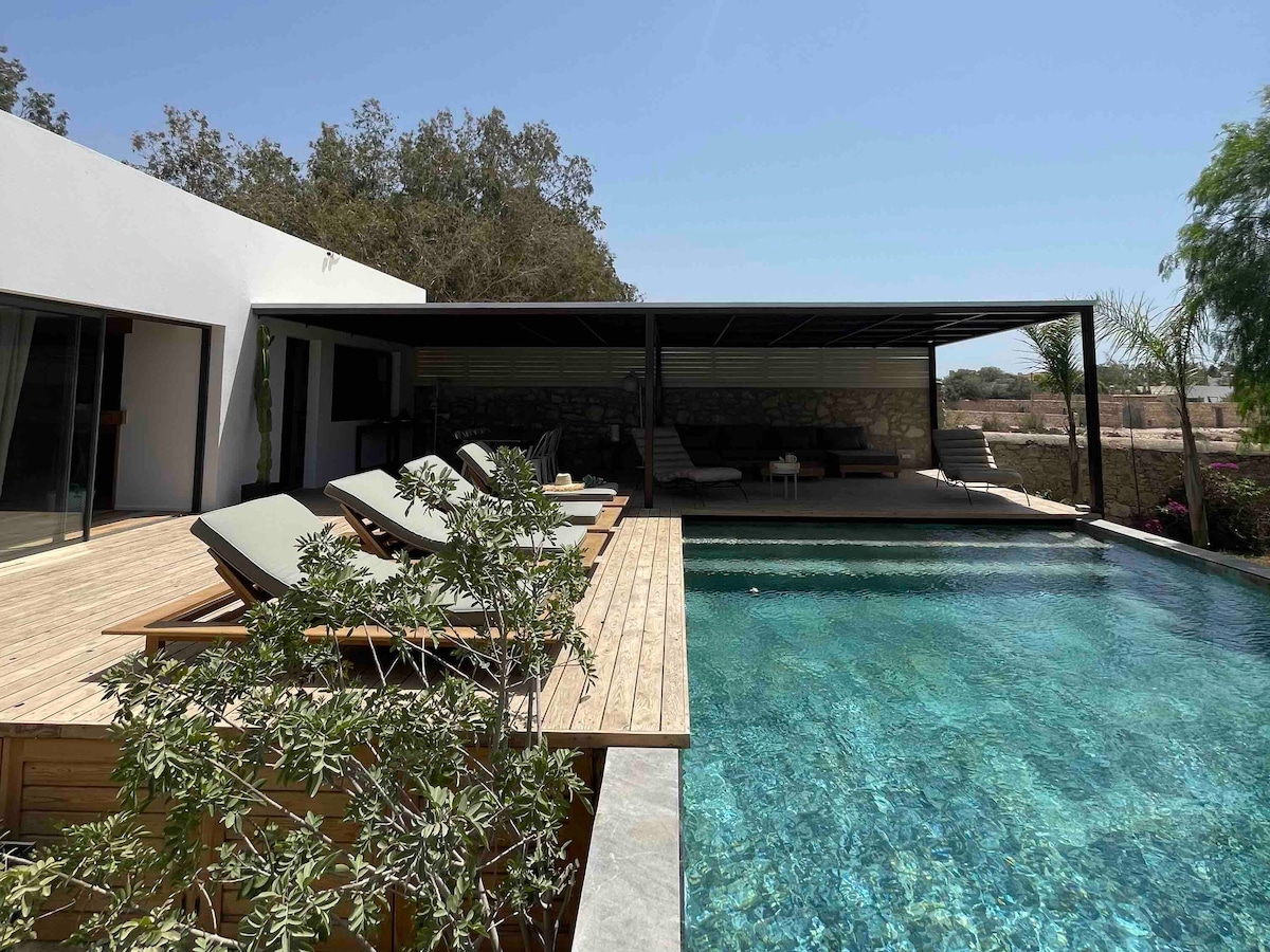ВИЛЛА С ПЕРВЫМ РЕЙТИНГОМ с 305 отзывами на 5 звезд в 3 местах всего в 6 километрах от Эс-Сувейры Вилла площадью 160 кв. м полностью приватизировано без ступенек не упускается из виду но не изолированный ШИКАРНЫЙ ДЕКОР Вилла архитектора Между марокканскими традициями и изысканным дизайном ВЫСОКИЙ УРОВЕНЬ КОМФОРТА Wi-Fi 4G 3 спальни Simmons • 3 санузла Большая гостиная с видом на бассейн и сад камин Телевизор Samsung Giant Screen HDTV полностью оборудованная кухня, джакузи гриль ПИТАНИЕ ДОМА ПО ЖЕЛАНИЮ С БУШРОЙ