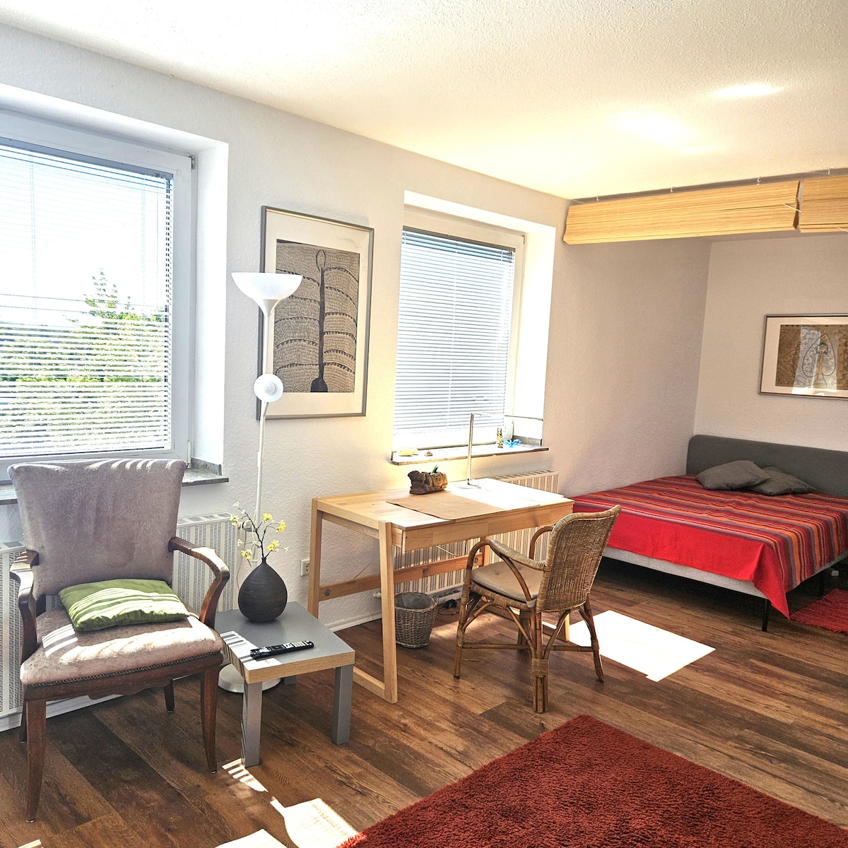 Студия расположена в мансарде нашего дома на юге города Мюльхайм-ан-дер-Рур, в районе Холтаузен/Раадт. Тихое место прямо на территории природного заповедника не исключает очень хорошее транспортное сообщение. Остановка общественного транспорта до центра и главного железнодорожного вокзала находится в нескольких минутах ходьбы. До А52 можно доехать на машине за 3 минуты. Messe Essen: около 10 минут; Messe Ddorf: около 30 минут. Аэропорт Ддорф: около 20 минут; CentrO: около 25 минут (каждая на машине).