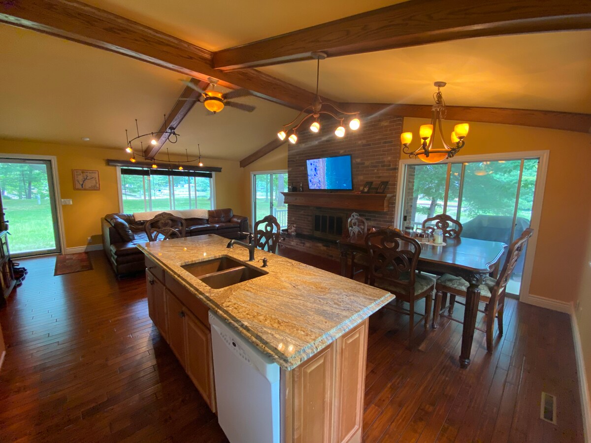 Домик с видом на озеро и гостевой дом с полным доступом ко всем видам спорта. Озеро Элк с большим пространством для связи с понтоном, гидроциклом или лодкой. Бесплатный доступ на каяке. Костровище с прекрасным видом на озеро Элк. Много спального места, поэтому этот домик идеально подходит для больших семей, а также для групп по охоте/рыбалке или девушек/ мальчиков на выходные! Игровая комната с бильярдным столом, шаффл-бордом, дротиками и хоккеем с пузырьками, прикрепленными к гостевому дому. В пешей доступности от бара Elk Lake (очень хорошая еда и атмосфера)!