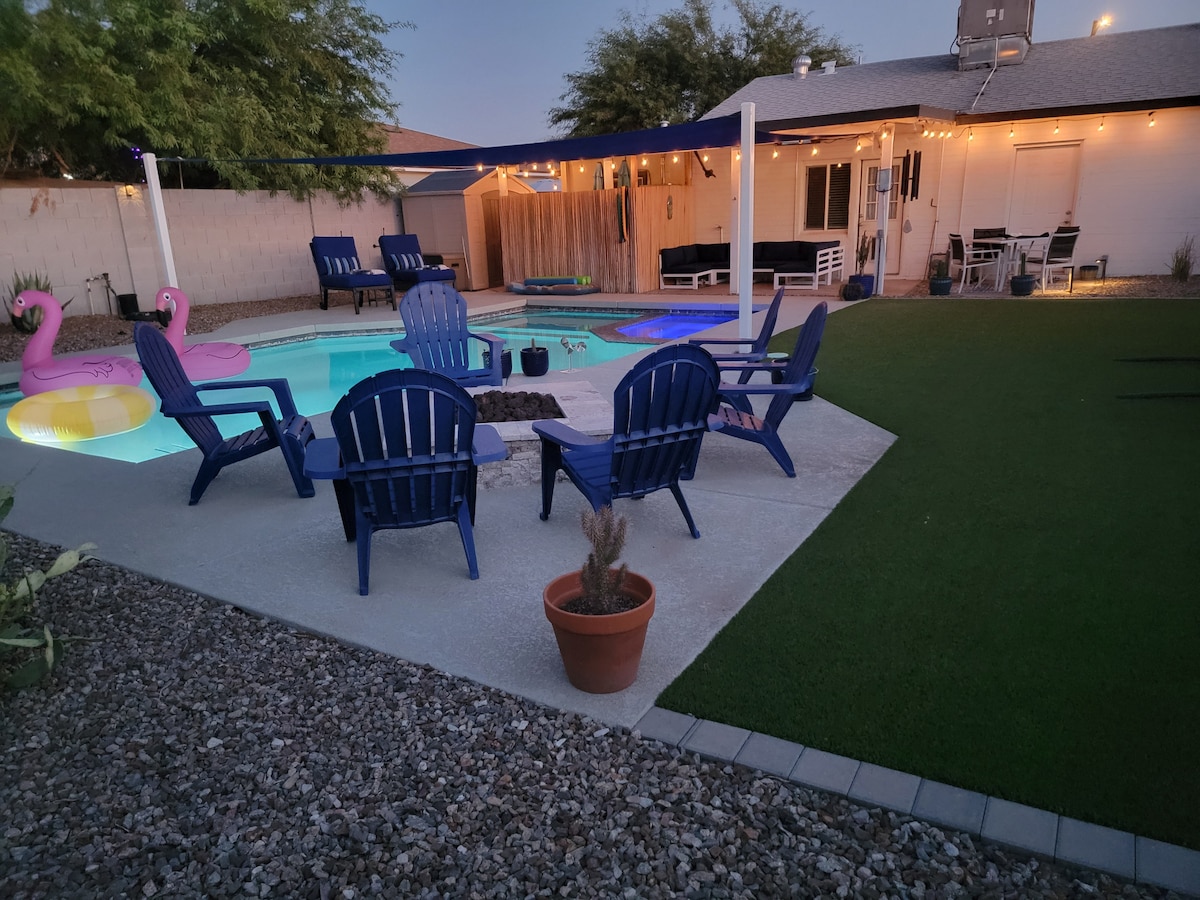 Насладитесь стильным отдыхом в этом люксе, расположенном в центре города, менее чем в 10 минутах езды от центра города и аэропорта. Вы найдете это место ПОТРЯСАЮЩИМ! Красивый кактус у бассейна. Ваше собственное личное жилое пространство на открытом воздухе с телевизором, столом на 4 человек и секционным диваном. 5 минут до поля для гольфа Encanto. Отдельный вход и парковочное место. Квартира-студия, бассейн с соленой водой. Насладитесь ковриками для йоги для утренней растяжки у бассейна или гамаком для сна. Завтрак и кофе/чай.