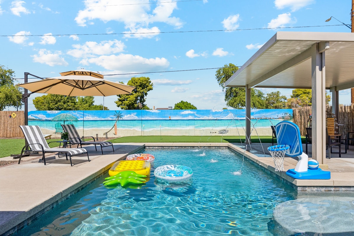 🏊 Круглогодичный отдых в бассейне с подогреваемой соленой водой и спа (безопасно для кожи/глаз). 🔥 Уютное жилье с камином 🍳 Полностью укомплектованная кухня + барбекю на открытом воздухе. 🎱 Игровая комната с бильярдным столом, настольным футболом, дротиками и телевизором с большим экраном. 🌞 Обеденная зона и бар на улице, чтобы насладиться погодой в Аризоне 📺 Уличный телевизор для игр/фильмов во время отдыха в спа. 🚗 Легко добраться до 2 основных автострад. 🎨 Искусно и уникально оформленное жилье Курортный отдых в Фениксе (почтовый индекс Глендейла) — идеально подходит для семейного отдыха, гольфа и отпуска