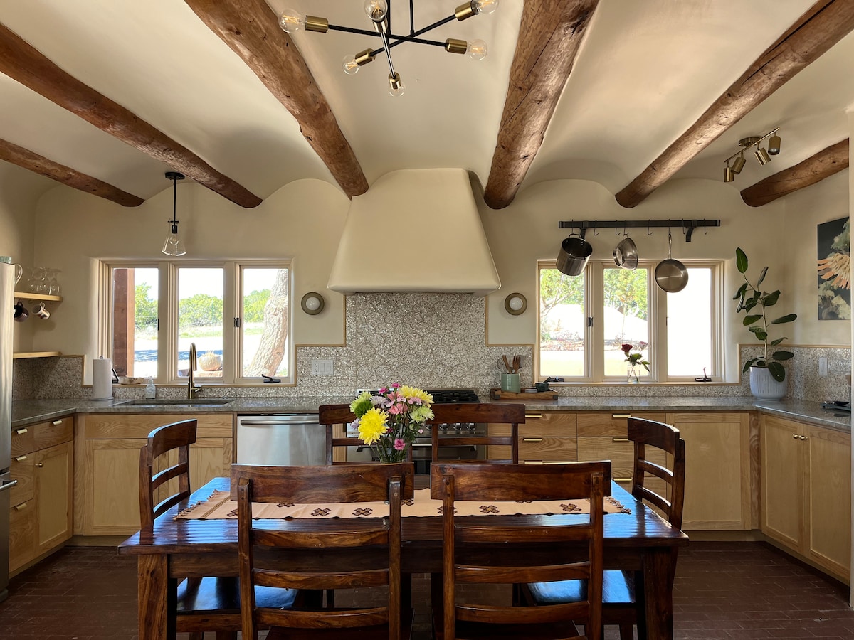 Идеально подходит для любителей звезд, птиц и опылителей! Расположена примерно в 10 милях к югу от площади и каньон-роуд, с потрясающим лунным и звездным небом в ясные ночи, многочисленными фруктовыми деревьями и множеством цветов в сезон. В этом доме из глинобитного отдыха в пебло, есть высокие потолки, большая кухня и столовая, сбор дождевой воды, солнечные панели и пассивный солнечный дизайн. Это прекрасный ретрит в Санта-Фе для семей или друзей. Наслаждайтесь ужином на открытом воздухе или уютным отдыхом в помещении и на улице.